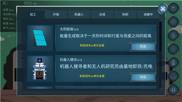 我的顺序是先造两个机器人模块,接着造三个太阳能板,两个机器人制造(灰色的机器人)升到两级(如果能量跟不上就先不要升级),太阳能板全部升到两级(金属应该用完了)。
