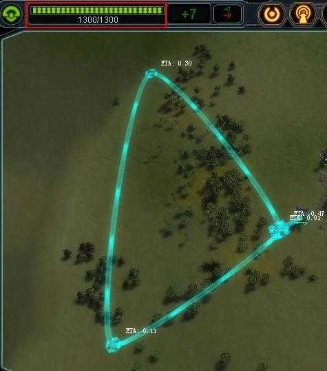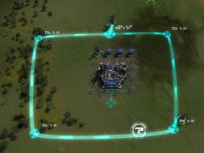 现在我计划让ACU回收这些树木并将其转化为资源,但逐一点选每棵树会不会太繁琐?宝贵的时间岂不是都浪费了?别担心,我有个“一网打尽”的办法:选中ACU后按住[Shift]键,再按下[P]键,接着像图里展示的那样划定回收范围。这样ACU就会沿着蓝线移动,并且在它的可视范围内(不只是圈定区域内的树木)自动回收树木。不过要注意,如果资源已经满了,ACU就只会沿着线路巡逻,不会进行回收操作。这个方法的用途不止于回收——你还可以用同样的步骤,让工程车或ACU在基地周边巡逻,它们在巡逻时会自动完成回收资源、修理受损单位等多项任务,具体效果可以参考下图。