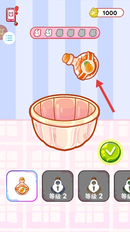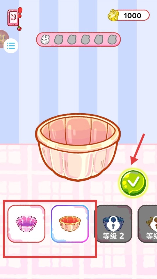 挑选模具(粉色、橙色等需解锁的款式),点击绿色对勾以确认容器。
