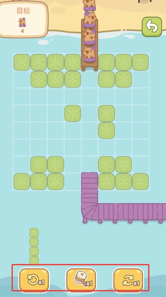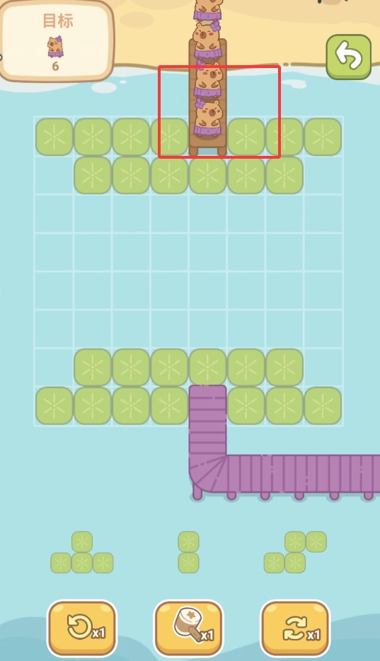 拖动屏幕下方不同形状的方块,在河面上灵活拼接组合,为水豚搭建起安全的渡河路径。