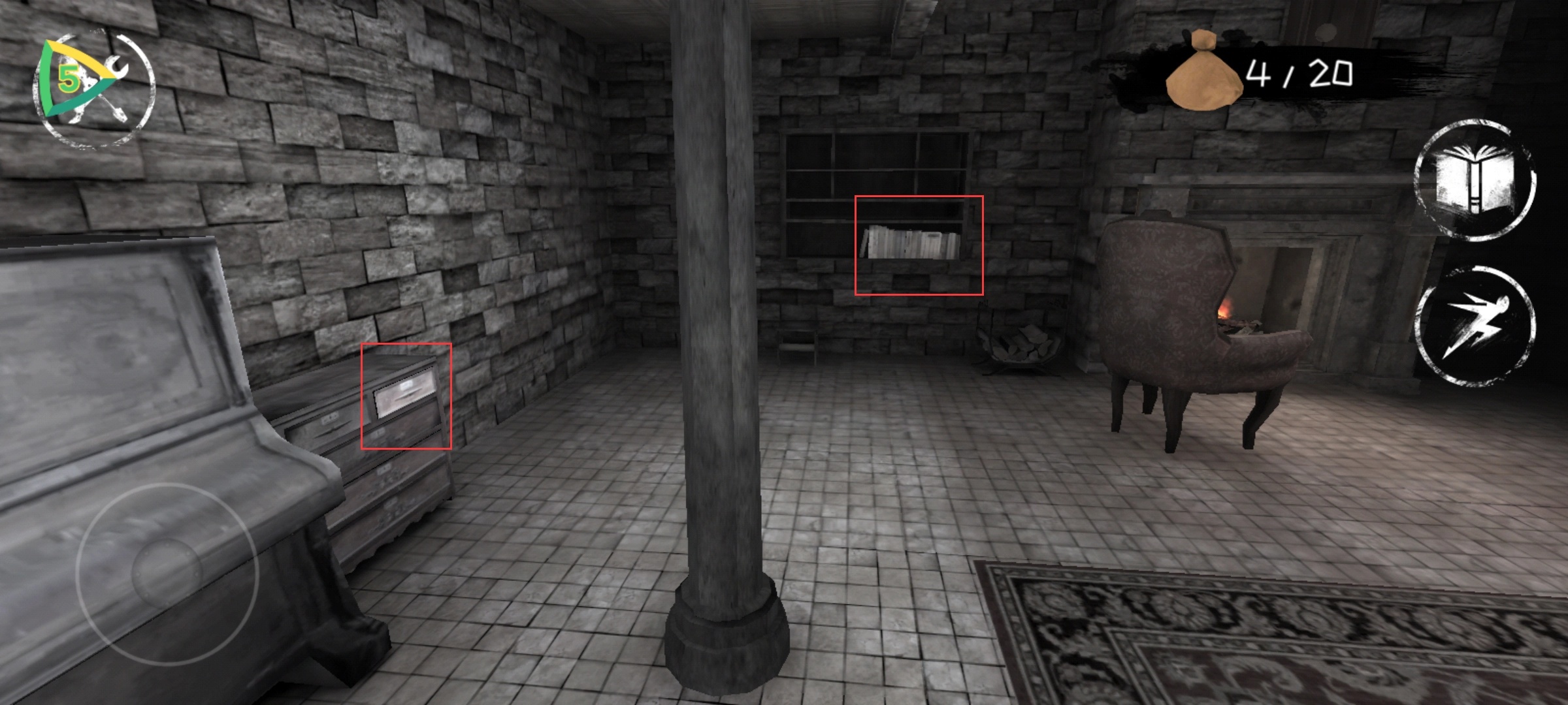 完成这些步骤后,我们通过眼睛来确认女鬼的位置。当女鬼进入地下室时,我们就前往楼上。在二楼,玩家们大约能收集到十八个钱袋和五个左右的眼睛。之后使用眼睛,等女鬼再次回到地下室时,我们返回最初的客厅,趁着女鬼上楼的间隙进入地下室。