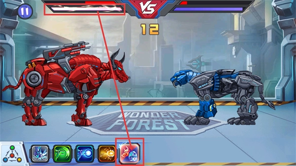 进入【VS】对战后,留意上方的【12】倒计时,同时借助已解锁的技能图标,在【WONDER-FOREST】场景里适时释放技能进行输出。
