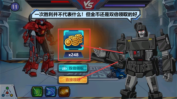 战斗获胜后,你可以选择【直接领取】来获取【x248-金币】,或者通过【双倍领取】观看视频以获得翻倍奖励,从而加快资源积累的速度。