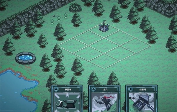 游戏界面下方排列着多张功能各异的卡牌,例如能用来建造铁匠铺、侦查塔之类的建筑。