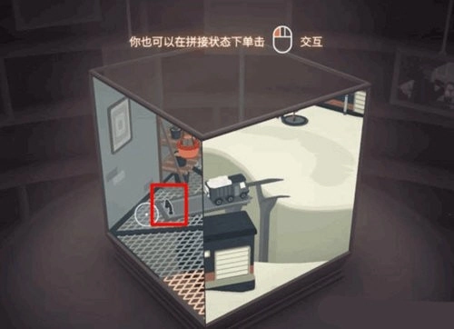 我们能够借助桌上的台灯来完成拼接操作,以此把仓库门前地面的井盖顶起来,进而开启立方体顶部的画面。
