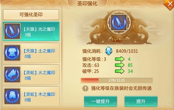 圣印强化需要消耗五行晶魄,每次强化会增加一定的熟练度,当熟练度积满时强化等级就会提升。圣印的阶级不同,强化所能达到的上限也不一样;而且圣印不同部分进行强化后,所增加的属性也存在差异。需要注意的是,强化仅对圣印的基础属性有提升效果,并不会强化其五行属性。