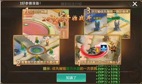 每击破一座敌方防御塔,敌方水晶的生命值就会降低10%,最多可减少70%。尽可能多地摧毁防御塔,能更快速地击破水晶。
