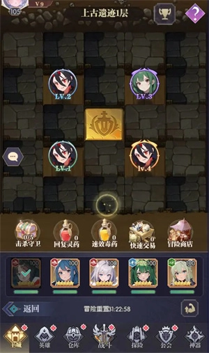 玩家进入游戏后,可对前方格子展开探索;每天依据不同格子,能执行英雄雇佣、挑战虚空守卫、泉水浸泡、复活英雄、向虚空商人购买商品等操作,玩家可根据自身需求选择行进路线。