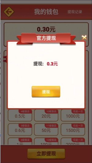 真的没问题,在游戏里每次顺利完成订单,除了会得到货币奖励外,还会留下一个红包,点击就能领取金额不同的红包奖励。等达到特定等级就能直接提现,最低提现门槛是0.3,而且饭馆等级越高,能提现的金额也就越多哦!