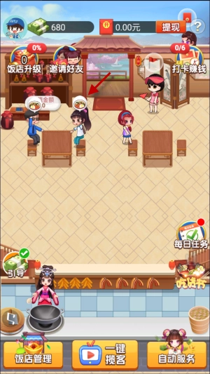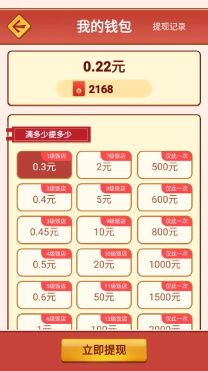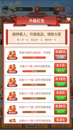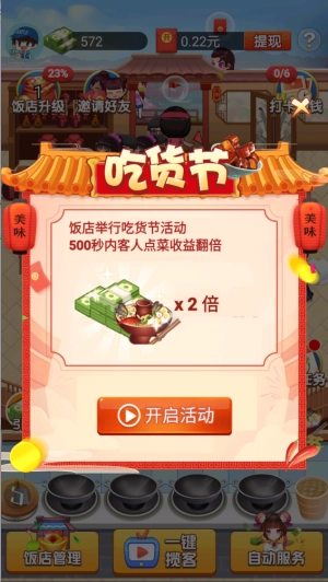 每次完成顾客的订单,不仅能拿到游戏货币,还能获得对应的红包,等饭馆等级达标后就能直接提现啦!