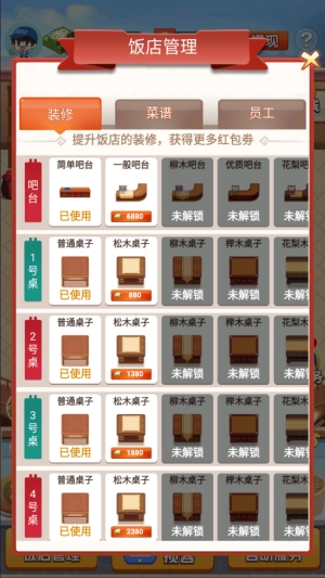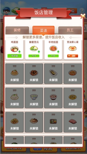 在菜谱界面,你可以通过付费解锁更多菜品,还能对现有菜品进行升级,以此提高收益。