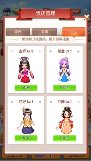 在员工界面里,我们能够雇佣新员工或是对她们进行升级,员工数量最多可以达到四位,如此一来工作效率也会提升。