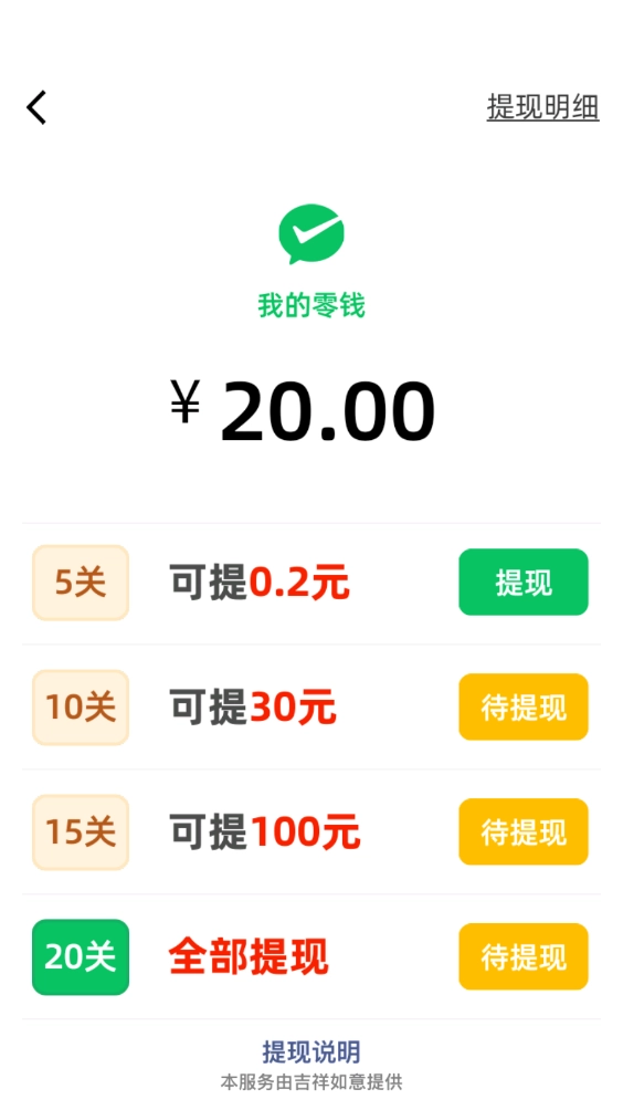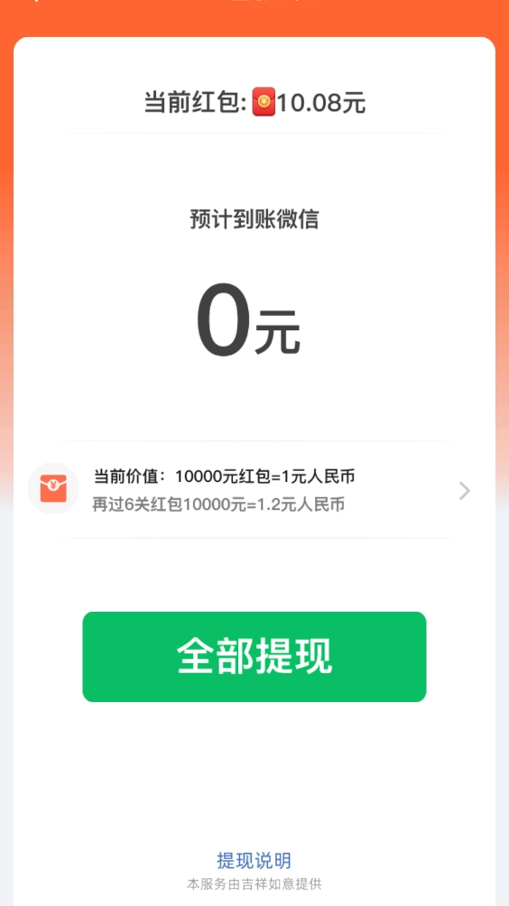 通过闯关积累的红包都可以按照万分之一的比例兑换。