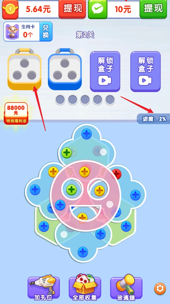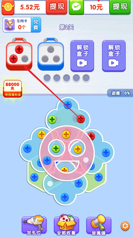 每个盒子能收纳三颗同色螺丝,装满就会消除,接着出现新盒子,同时右侧进度增加。