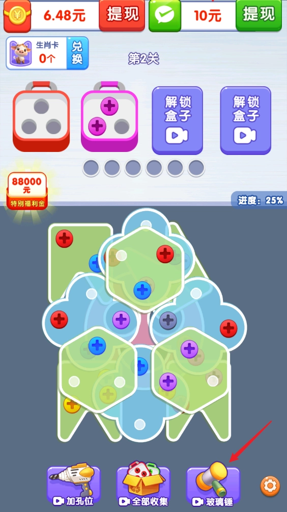 除此之外,游戏里还配备了3种可供使用的道具,像这把玻璃锤,就能敲碎任何玻璃,进而消除上面的螺丝。