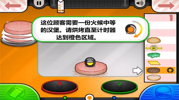 这位顾客想要一份熟度中等的汉堡,稍等片刻,等计时器跳到橙色区域就可以了。