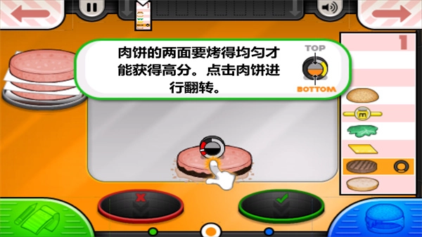 要记住,这个肉饼的两面得烤得均匀些,这样才能拿到高分,直接点击肉饼就能翻转它。