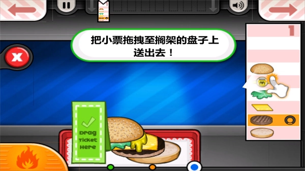 制作完成汉堡,把小票拖拽至搁架的盘子上送出去!