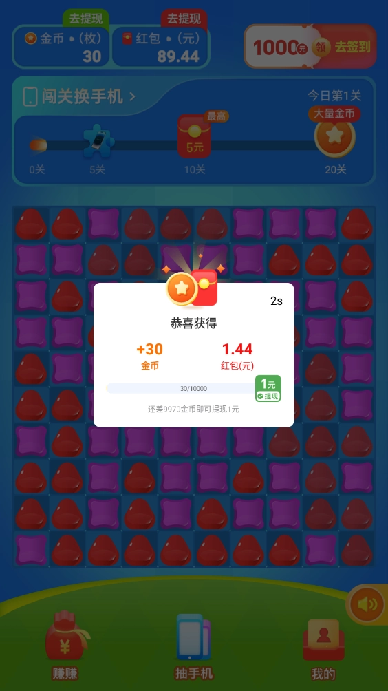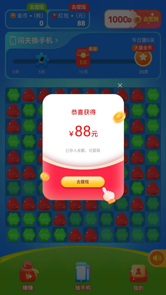 消除所有方块就能通关并获得相应奖励,开启后还能得到随机红包和金币。