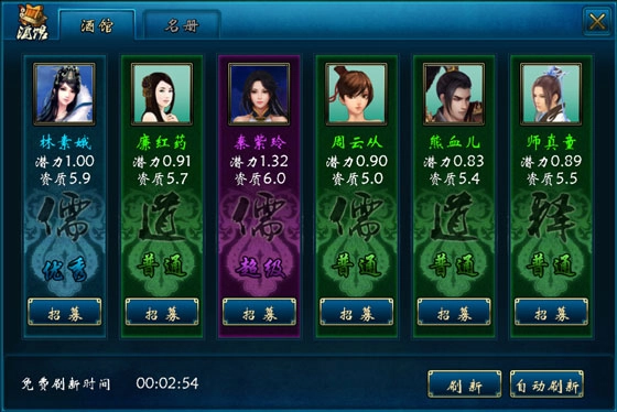 在招募界面的左下方,设有免费刷新时间,每1小时可获得1次免费刷新将领的机会。一旦免费时间到来,建议直接使用。酒馆每次刷新会随机出现6名将领。若免费时间未到,也能通过仙石或礼券来刷新酒馆。通常手动刷新几次,就有机会出现蓝色品质及以上的散仙;自动刷新则支持选择将领品质与设定最大刷新次数。需要仔细查看散仙的“潜力”和“资质”,这两项是衡量散仙强弱的关键指标。