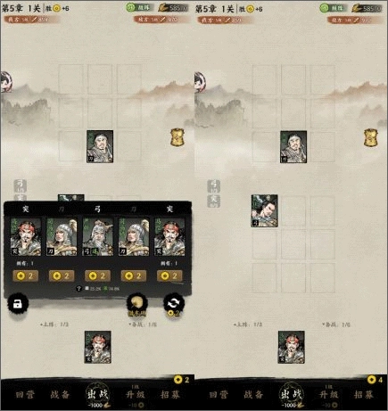 备战状态分为招募和上阵两个环节。进入主线关卡后,点击界面上的【继续】按钮就能开启关卡战斗。点击该按钮后,便会进入备战状态。此时首先会弹出招募窗口(如图一所示),主公需依据自身持有的军饷(沙盒资源)数量,来招募相应的武将。