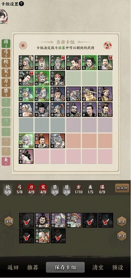 卡组的调整:怎样才能让招募列表里尽可能出现自己心仪的武将呢?这就需要用到卡组功能了。在章节界面点击右下角的“卡组”按钮,就能进入卡组调整界面。