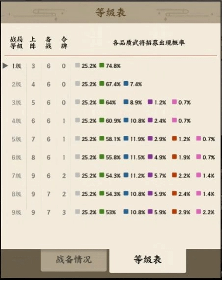 战局等级:消耗军饷能够提升战局等级,不同的战局等级会增加不同品质武将在招募列表中的刷新概率。通过下图的等级表,可查看各品质武将的出现几率,其中白色对应杂兵、绿色对应良将、蓝色对应名将、紫色对应稀世、橙色对应绝品、粉色对应美人。若未达到对应品质武将所需的战局等级要求,招募列表中就不会刷新出该品质的武将。