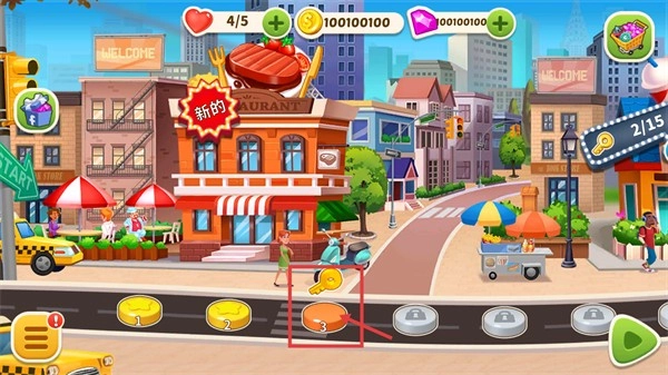 找到标注为【新的】的餐厅建筑,点击下方被框选的【钥匙】图标,就能解锁并进入该餐厅的烹饪关卡。