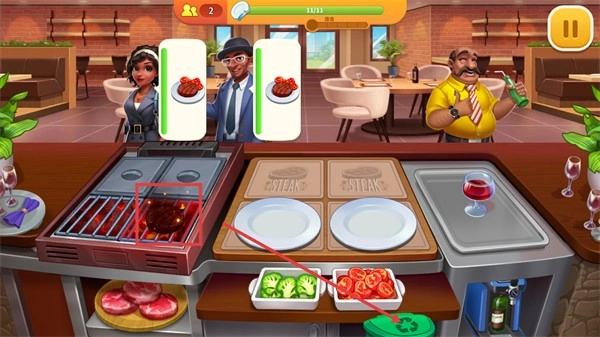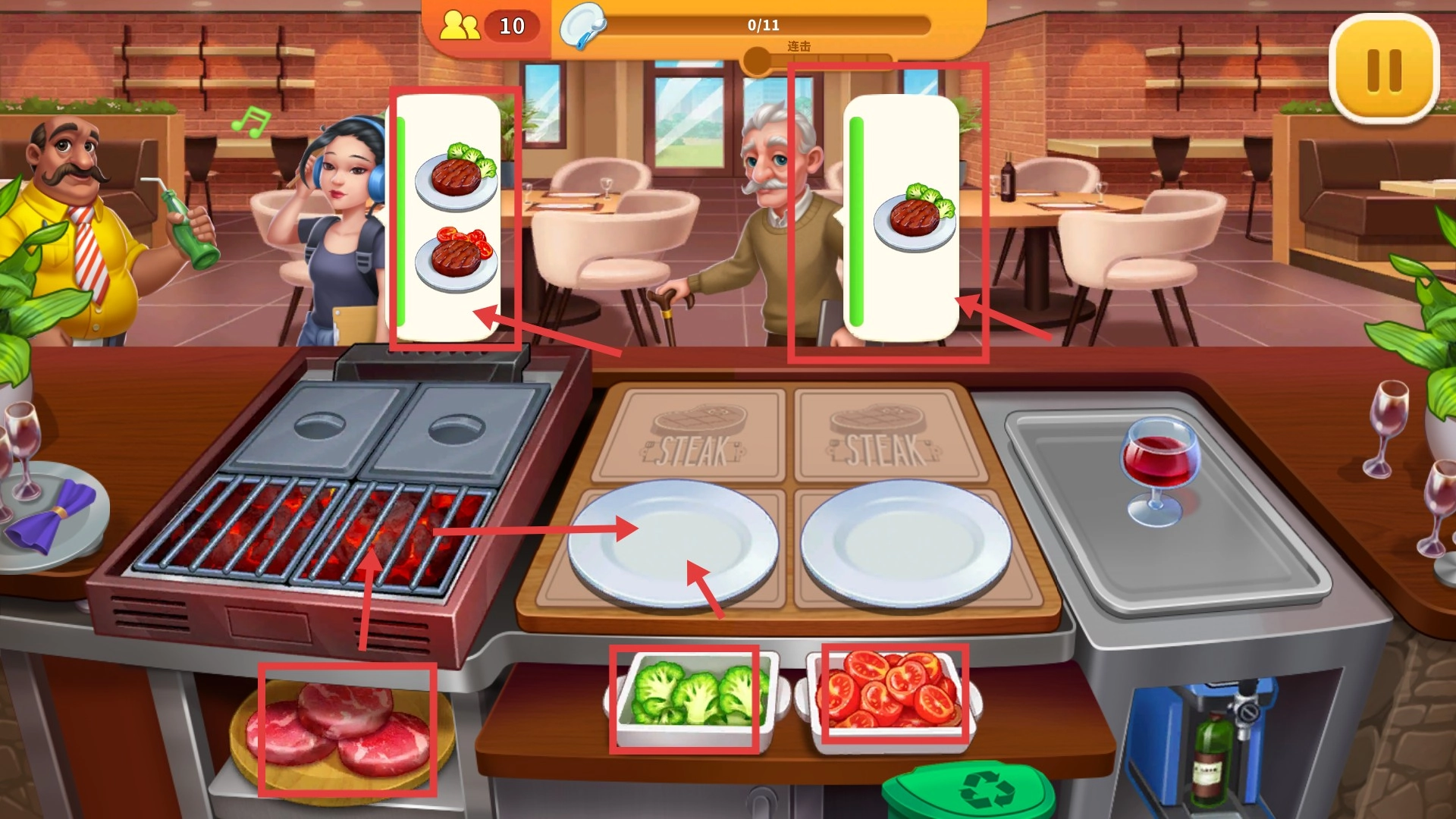 留意顾客的订单要求,拿取【餐盘】来搭配【牛排】和各类食材,按照指示把相应的菜品送到顾客手中,完成订单以此积累进度。