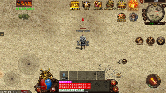 3、丰厚礼包与充足资源:上线就能领取超大包裹和仓库,所有装备和材料都能通过打怪获取,资源十分充足。
