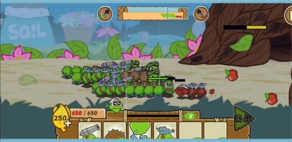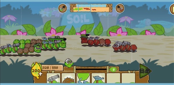 通过收集树叶这一资源,召唤各类毛毛虫士兵投入战斗,不同兵种对应的树叶消耗量各不相同,需要对出兵的节奏进行合理规划。