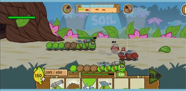 4、先放出一只基础毛毛虫阻挡敌方攻势,再用攒下的叶子生产更厉害的毛毛虫。