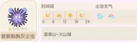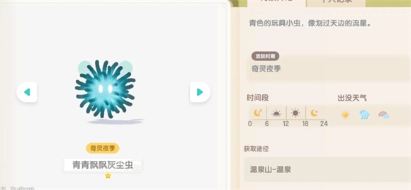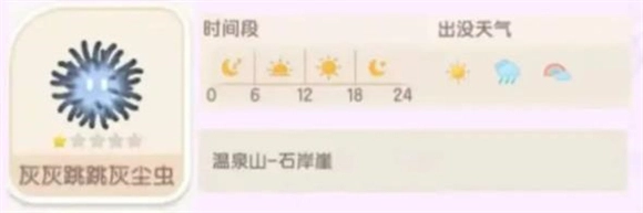 青青飘飘灰尘虫能够在温泉区域捕捉到,它的出没时间段是全天,出没天气为所有天气。