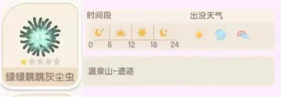 绿绿跳跳灰尘虫能在温泉山的遗迹区域找到,它全天都可能出没,而且不管什么天气都能遇到。这种虫喜欢藏在草丛里,想捉到它的话,尽量靠近草丛就好。