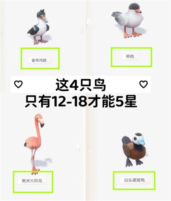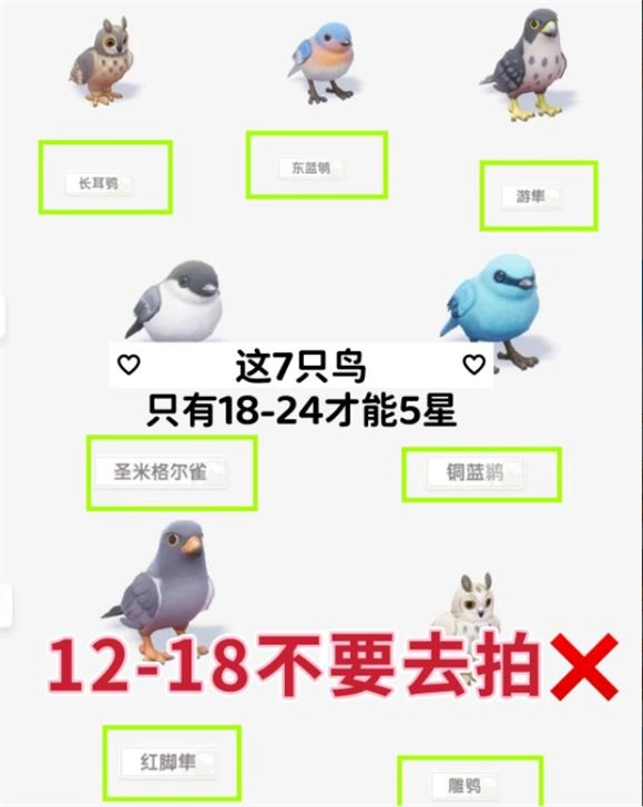 7、去拍鸟吧!拍我图里标记出来的那4只。别拍那7只需要18到24才能达到5星的鸟,这些后面再拍,先拍4星的就行。