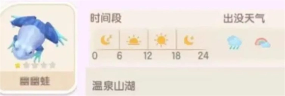 幽幽蛙的活动范围是温泉山湖区域,全天都能见到它们的身影,尤其在雨天和彩虹天更容易出现。