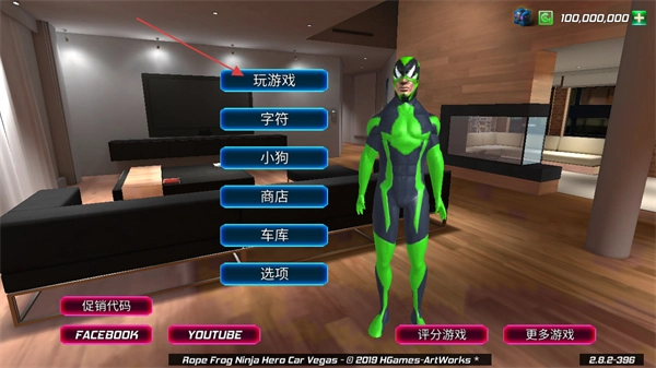 1、这是绳蛙忍者英雄的主界面,设有玩游戏、字符等功能选项,点击“玩游戏”选项即可进入游戏。