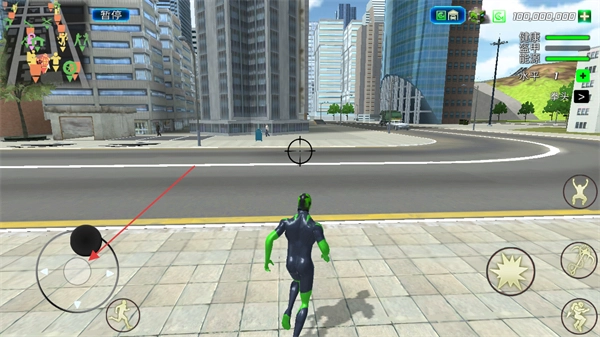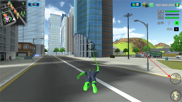 3、点击右下角的绳索按钮,能够发射绳索并附着到建筑等目标上,以此实现角色的快速移动,这是该游戏的核心移动方式之一。