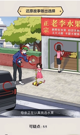 1、玩家进入游戏关卡后,首先要点击犯人的口罩、手中的棒棒糖、手上的手机、女人的头部以及汽车的后备箱。