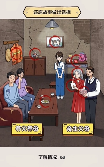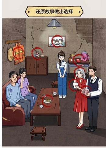 2、接着进入第二个场景,依次点击相框、墙上的衣物、书包旁边的红色本子、餐桌上的食物、白发女性、手中的纸张以及盒子。