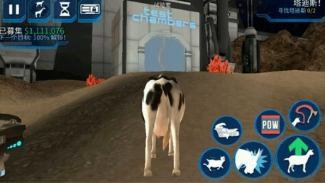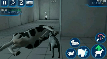 1、玩家抵达试验室后会领取任务,进入试验室内部,这里需要开展四个实验,第一步要踩下中间的蓝色按钮,随即会有一头牛掉落下来。