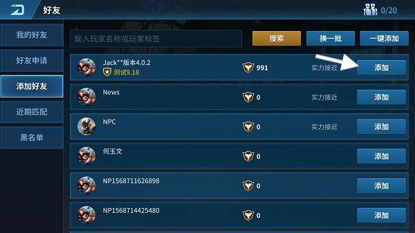 3、添加好友:在添加好友的页面标签下,系统会自动推荐部分玩家,玩家既可以点击申请按钮发起好友申请,也能在输入栏中填写玩家的标签或名字来搜索并添加好友。