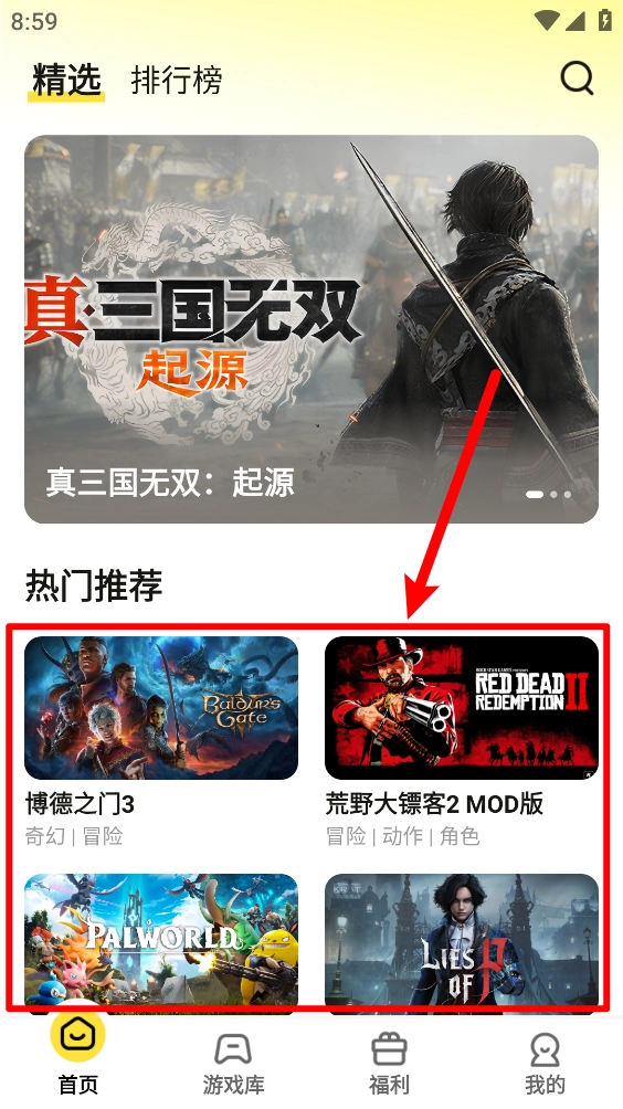 2、进入首页,如图,选择喜欢的游戏点击进入。