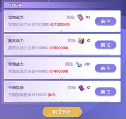 1、当前的三个初始职业在满足一定条件后,均可进行转职操作,转职需完成对应的转职任务,任务栏内会清晰显示转职的方向及具体要求。