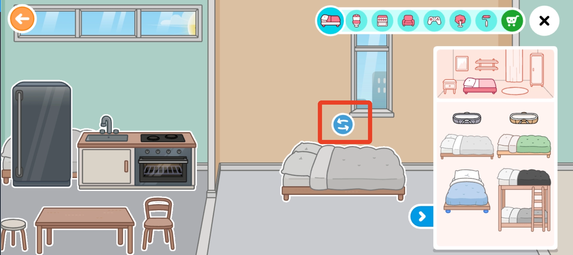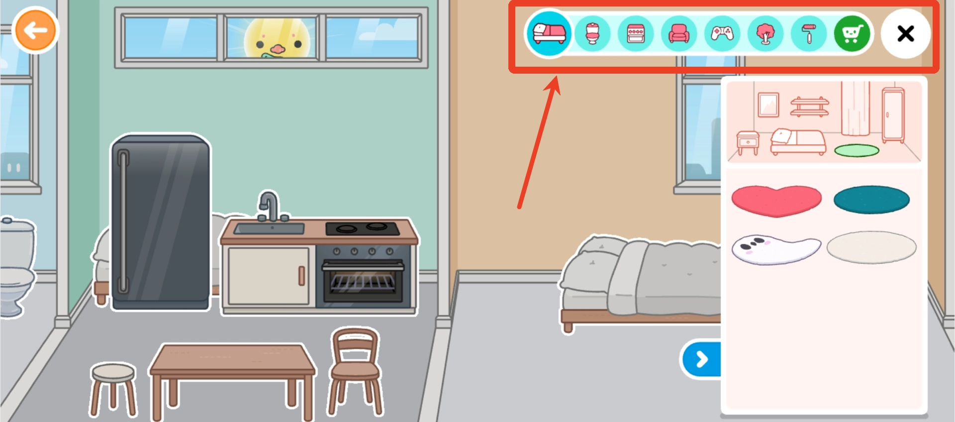 4、点击家具按钮,挑选你喜爱的家具拖动摆放,点击家具上方的箭头就能调整其方向。