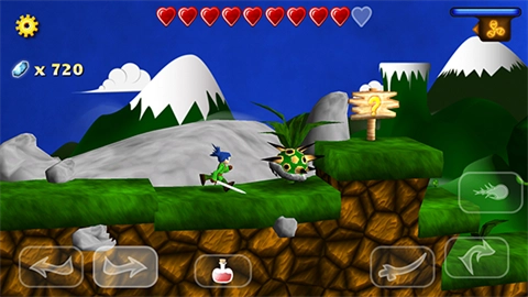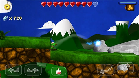 就像图里右下角显示的那样,那个带着魔法弹样式的图标就是魔法攻击的按键,点它就能发动魔法攻击。画面右上方是魔法能量条,要是蓝色的能量条空了(数值为0),玩家就没法释放法术了。不过能量条会随着时间自动恢复能量,另外,在游戏里捡到小蓝瓶也能直接把能量补满。