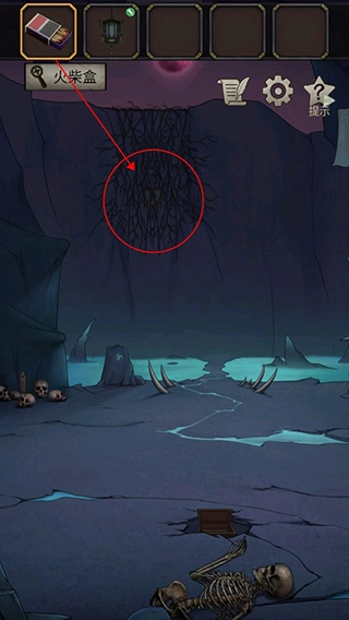 8、进入这个阴森的场景后,点击后方的骷髅堆。在骷髅堆上能获取一根铁棍。