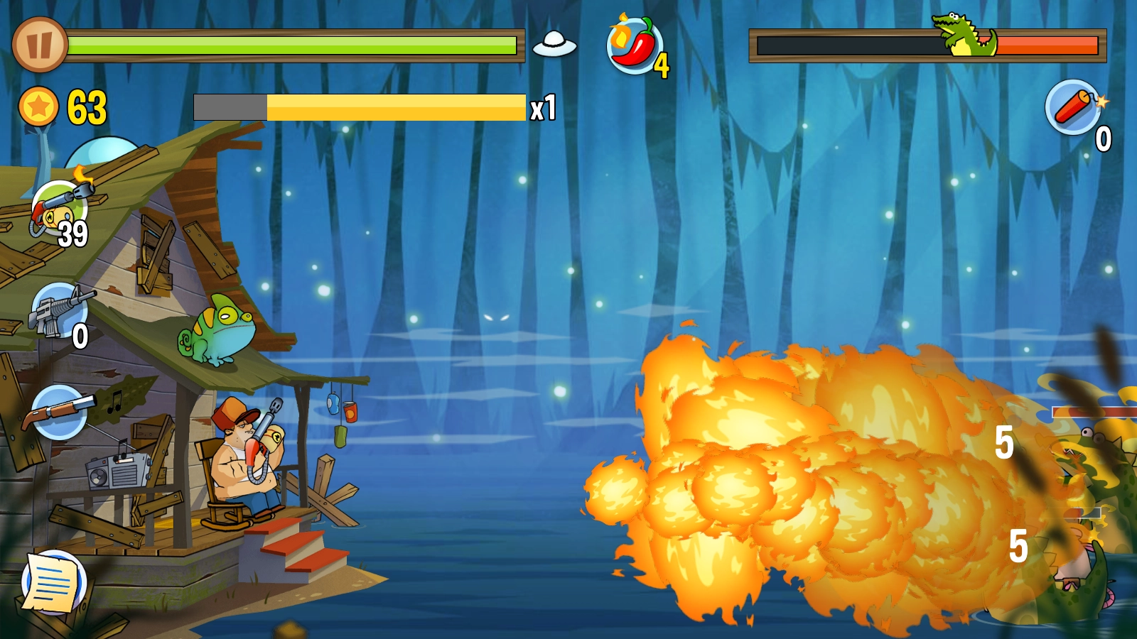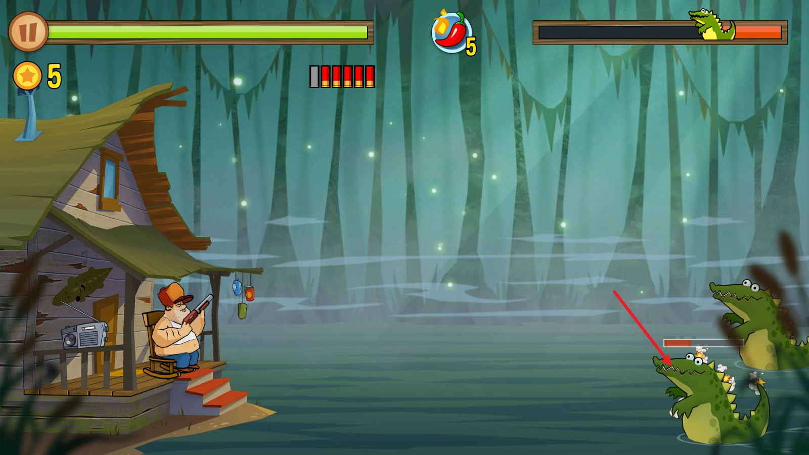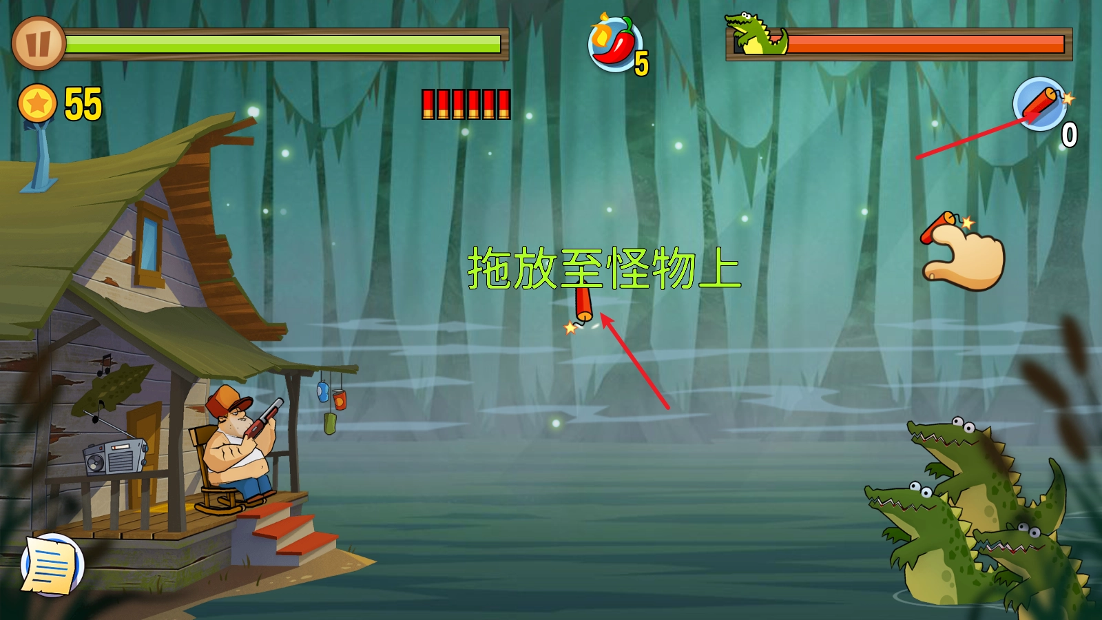 《沼泽激战》(Swamp Attack)是一款充满美式夸张风格的2D横版射击塔防游戏。游戏主人公居住在一片森林里,他的小木屋周边环绕着一片沼泽,沼泽中栖息着众多动物,这些动物随时可能对小木屋发起围攻。玩家需要化身为这位主人公,拿起手中的枪械守护小木屋,捍卫自己的领地! 游戏诙谐幽默的风格是其极具吸引力的特色之一。比如,主角即便陷入重重包围,依旧从容地坐在小板凳上悠闲打靶;而且手持不同武器时,还会呈现出各种呆萌的表情,十分有趣。游戏内设有丰富多样的关卡可供挑战,随着挑战的推进,玩家还能用金币升级武器、提升战力,以应对更多的挑战!