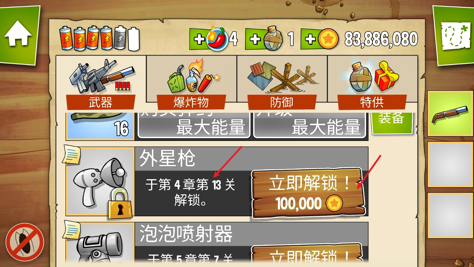 之后在武器这一栏就可以挑选武器了,部分武器需要通过一定关卡后,用金币解锁。
