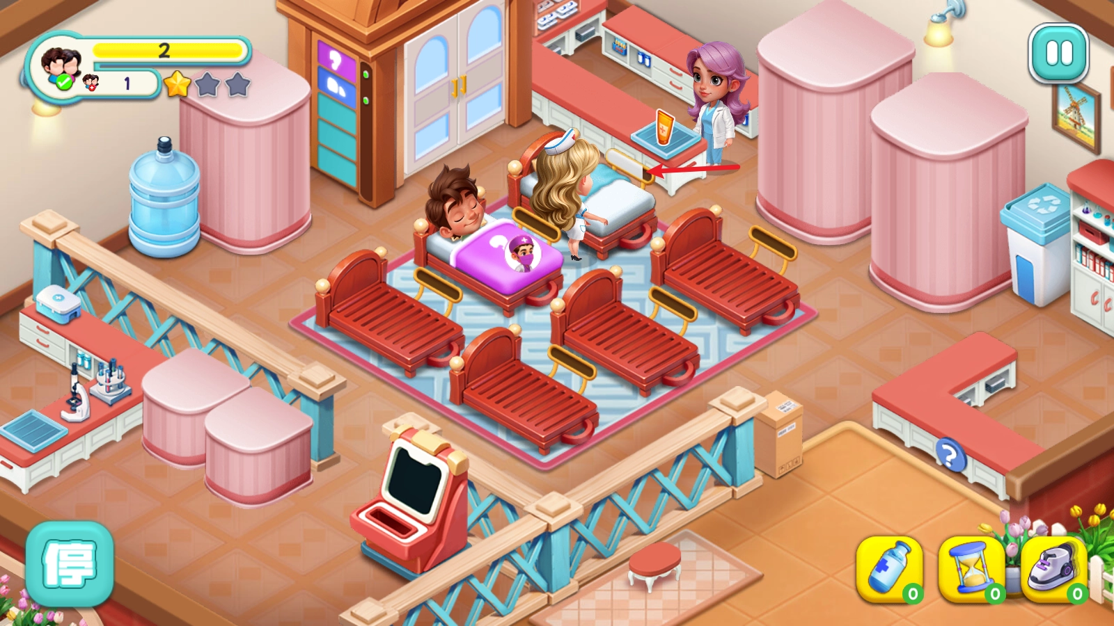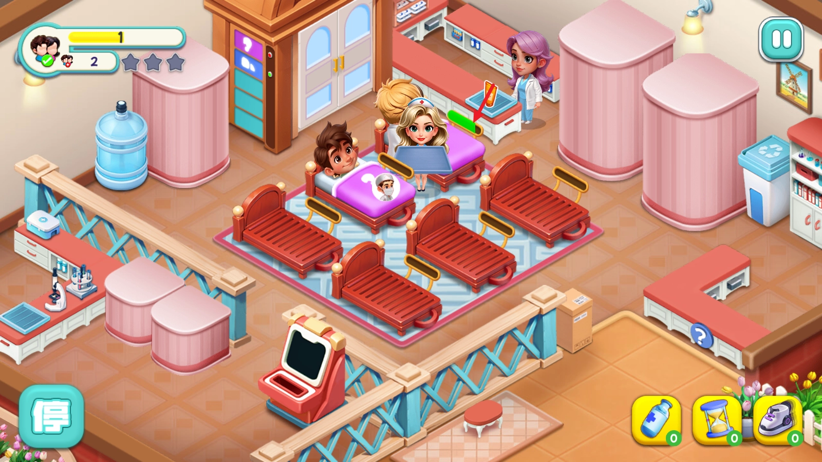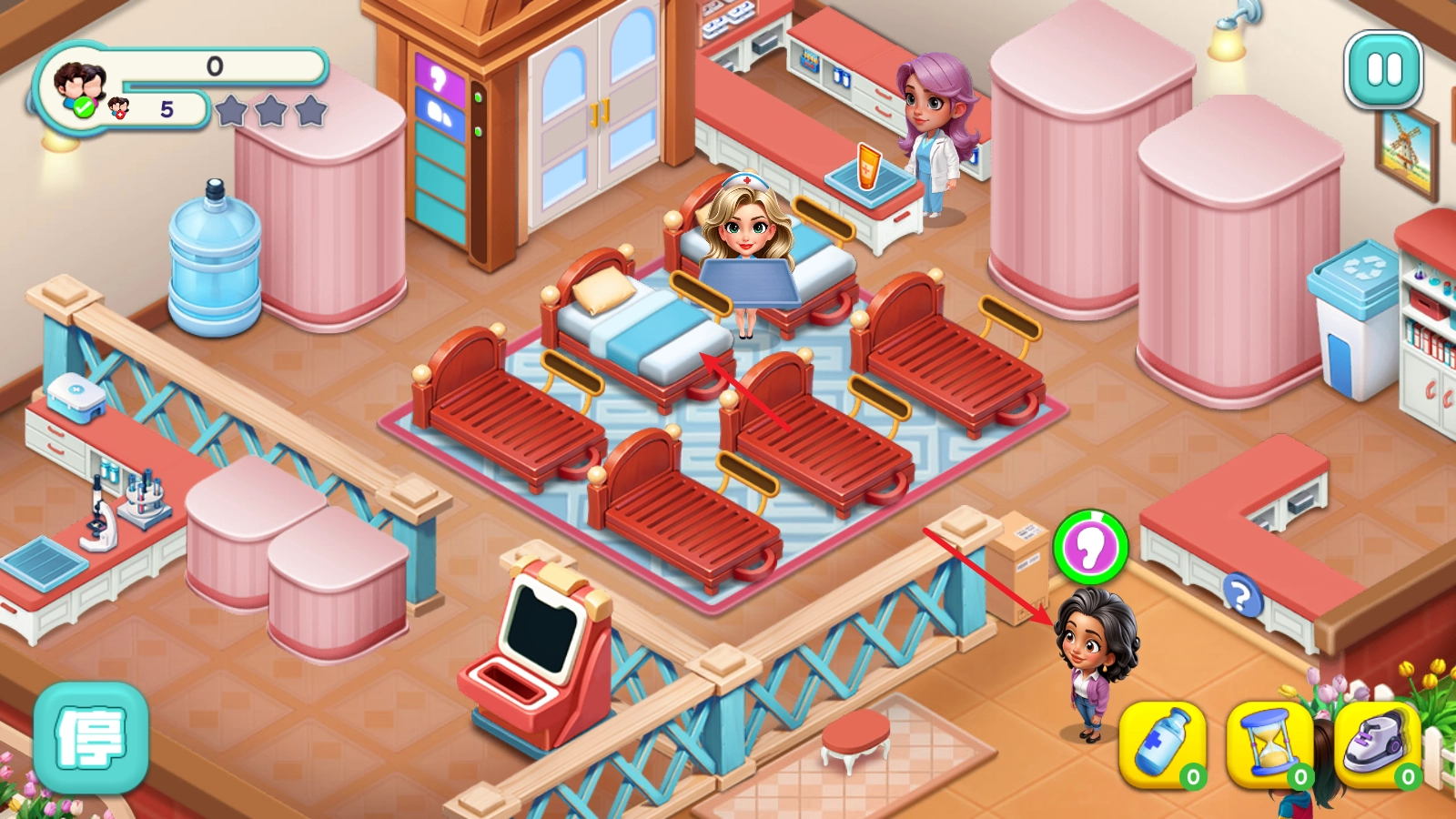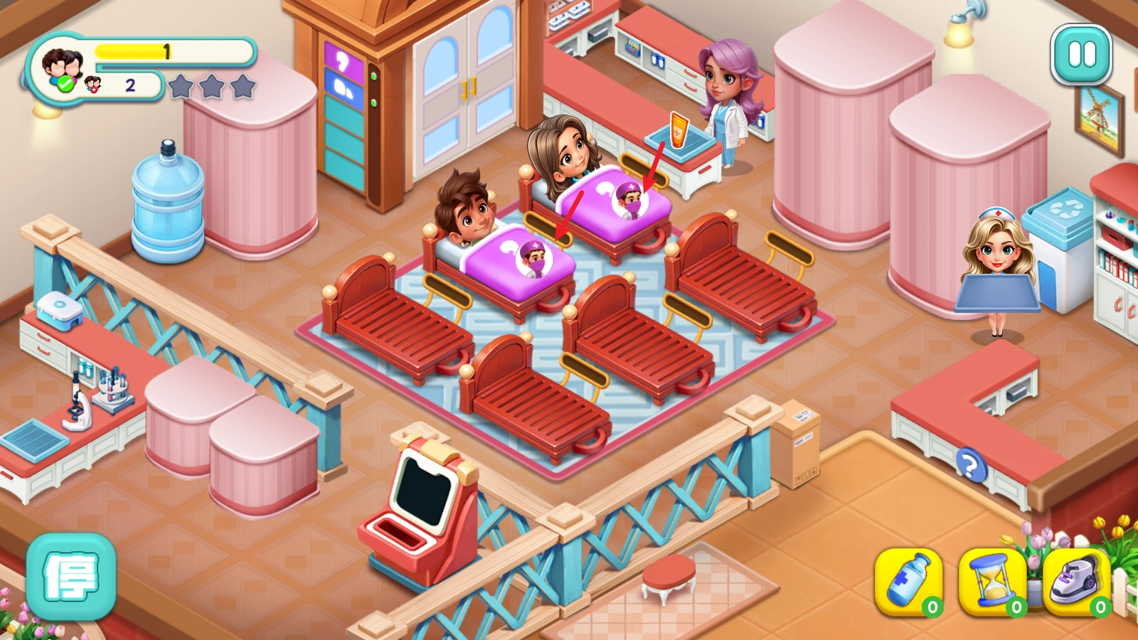 1、游戏开始后,门口会有病人等候,我们需要把他们拖到空床位上。